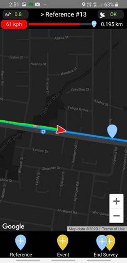 The software displays collected surveys on a Google Maps interface and allows for MP3 voice recording of events. Survey data is stored on the Android device, with the amount of collected data only limited by the storage capacity of that device.